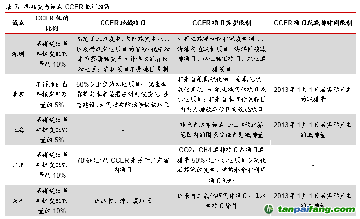 各試點(diǎn)實(shí)行不同抵消機(jī)制,抵消比例5%-10%之間。各試點(diǎn)均以CCER作為碳排放抵消指標(biāo),但抵消比例不同。北京、上海試點(diǎn)CCER抵消使用比例不得超過(guò)當(dāng)年核發(fā)配額量的5%;天津試點(diǎn)抵消使用比例不超過(guò)當(dāng)年實(shí)際排放量的10%;深圳、湖北試點(diǎn)抵消使用比例不超過(guò)配額量的10%;廣東的CCER抵消使用比例不超過(guò)企業(yè)上年度實(shí)際排放量的10%;重慶抵消使用比例不超過(guò)審定排放量的8%。 本+文內(nèi).容.來(lái).自:中`國(guó)`碳`排*放*交*易^網(wǎng) ta np ai fan g.com