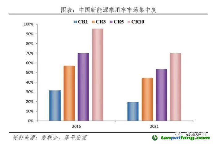 2016年,中國新能源汽車市場集中度指標CR1、CR3、CR5、CR10分別為31.6%、57.3%、70.1%和95.6%,到2021年分別降至19.5%、44.5%、53.4%和70.1%,市場的集中度出現(xiàn)明顯下降,眾多新生品牌涌入市場搶占市場份額。