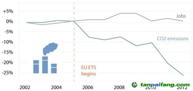 圖1 ETS對(duì)歐盟就業(yè)和CO2排放的影響 內(nèi)/容/來/自:中-國/碳-排*放^交%易#網(wǎng)-tan p a i fang . com