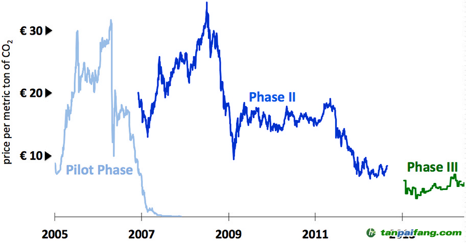 是為期三年的試點(diǎn)階段,主要為《京都議定書》積累經(jīng)驗(yàn)、奠定基礎(chǔ)。該階段所限制的溫室氣體減排許可交易僅涉及CO2,行業(yè)覆蓋電力及能源密集型工業(yè),并設(shè)置了被納入體系的企業(yè)的門檻。在此期間,幾乎所有的補(bǔ)貼都免費(fèi)發(fā)放給企業(yè)。對(duì)超配額排放的企業(yè)罰款每噸40歐元。 本+文+內(nèi)/容/來/自:中-國-碳-排-放(交—易^網(wǎng)-tan pai fang . com