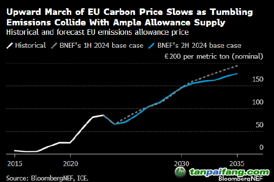 據(jù)預(yù)計(jì),2024年歐盟碳價(jià)將降至平均65歐元/噸。隨著排放配額供應(yīng)削減開始產(chǎn)生影響,本十年剩余時(shí)間內(nèi),短期內(nèi)低迷的價(jià)格水平將看到市場迎頭趕上。 本*文`內(nèi)/容/來/自:中-國-碳^排-放“交|易^網(wǎng)-tan pai fang . c o m