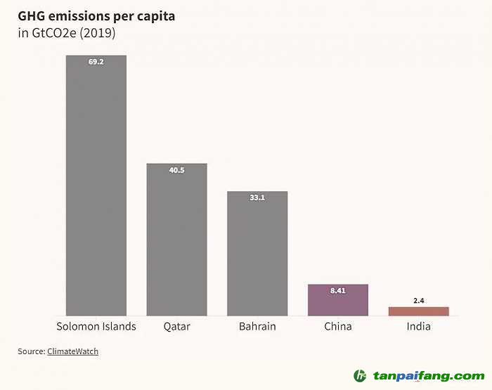 圖片來(lái)源:ClimateWatch - 全球溫室氣體排放占比餅圖為什么中國(guó)排量數(shù)字如此驚人?一方面是因?yàn)槿丝诨鶖?shù)龐大。根據(jù)2019年氣候觀察的數(shù)據(jù),人均排放量最高的國(guó)家為所羅門群島(每人每年69.2t二氧化碳當(dāng)量)、卡塔爾(每人每年40.5t二氧化碳當(dāng)量)、巴林(每人每年33.1t二氧化碳當(dāng)量)。中國(guó)公民的這一數(shù)字只有8.41t。印度是全球排放量排行第四的國(guó)家,但年人均排放量只有2.4t。 本@文$內(nèi).容.來(lái).自:中`國(guó)`碳`排*放^交*易^網(wǎng) t a np ai fan g.c om